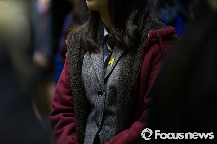 (안산=포커스뉴스) 2일 오전 경기도 안산시 단원구 올림픽기념관에서 열린 단원고등학교 입학식에 참석한 한 신입생의 교복에 노란 리본이 달려 있다.