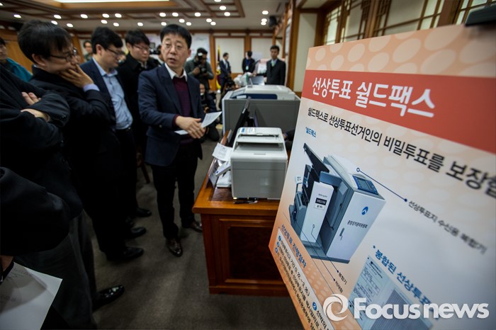 (과천=포커스뉴스) 2일 오전 경기도 과천시 중앙선거관리위원회에서 열린 '투표지분류기 및 선상투표 쉴드팩스 시연'에서 중앙선관위 직원이 선상투표 쉴드팩스 시연을 하고 있다.