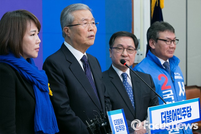 (서울=포커스뉴스) 김종인(왼쪽 두번째) 더불어민주당 비대위 대표가 2일 오전 서울 여의도 국회에서 전략공천 명단 발표 기자회견에 참석해, 인사말을 하고 있다. 왼쪽부터 전현희 전 의원(서울 강남을), 김 대표, 유영민 전 포스코 경영연구소 사장(부산 해운대갑), 서형수 전 한겨레신문 사장(경남 양산).