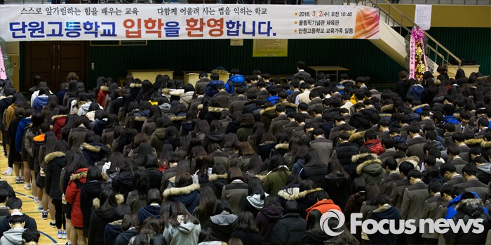 (안산=포커스뉴스) 2일 오전 경기도 안산시 단원구 올림픽기념관에서 열린 단원고등학교 입학식에 참석한 신입생들이 묵념하고 있다.