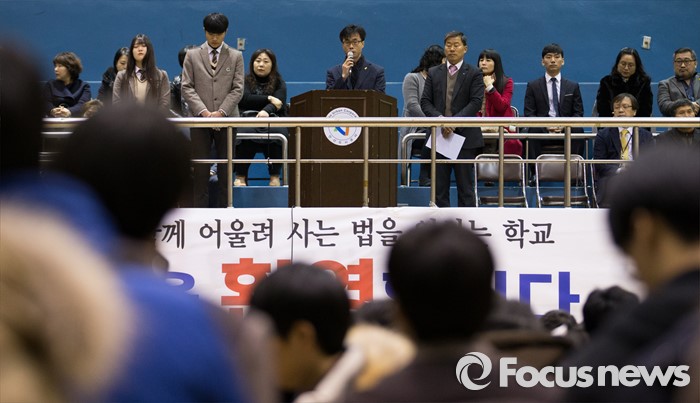 (안산=포커스뉴스) 전명선 4·16 가족협의회 위원장이 2일 오전 경기도 안산시 단원구 올림픽기념관에서 열린 단원고등학교 입학식에 참석해 '사랑하는 단원 가족들에게 드리는 글' 을 낭독하고 있다.