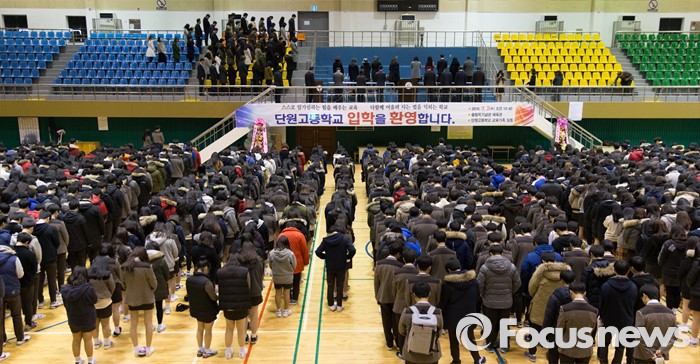 (안산=포커스뉴스) 2일 오전 경기도 안산시 단원구 올림픽기념관에서 열린 단원고등학교 입학식에 참석한 학생들이 묵념하고 있다.