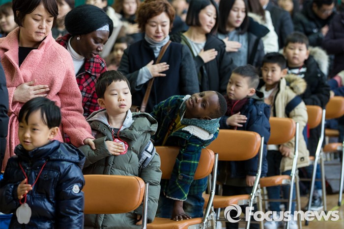 (서울=포커스뉴스) 2일 오전 서울 이태원 초등학교에서 열린 2016학년도 입학식에 참석한 신입생들이 국민의례를 하고 있다.