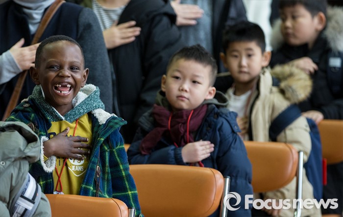 (서울=포커스뉴스) 2일 오전 서울 이태원 초등학교에서 열린 2016학년도 입학식에 참석한 신입생들이 국민의례를 하고 있다.