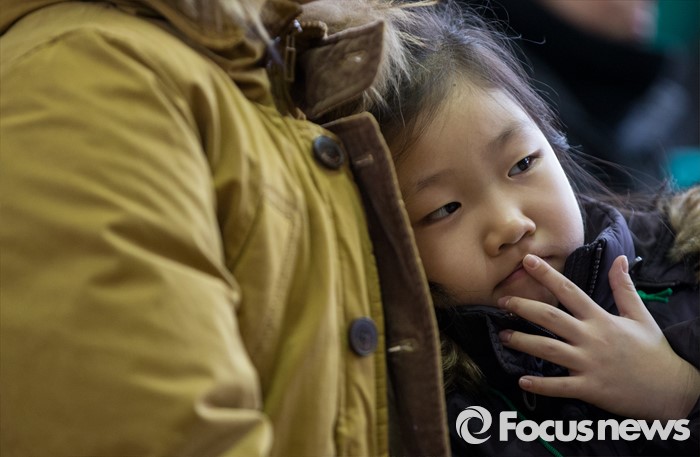 (서울=포커스뉴스) 2일 오전 서울 이태원 초등학교에서 열린 2016학년도 입학식에 참석한 신입생이 엄마 품에 기대고 있다.