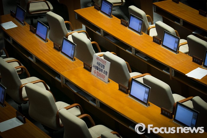 (서울=포커스뉴스) 테러방지법 직권상정에 반발해 야당이 세계 최장 기록의 필리버스터(무제한 토론)를 이어가고 있는 2일 오후 서울 여의도 국회 본회의장에서 최민희 더불어민주당 의원 자리에 테러방지법에 반대하는 피켓이 놓여 있다. 야당은 이날 필리버스터를 중단하고 선거법 등을 처리할 예정이다.