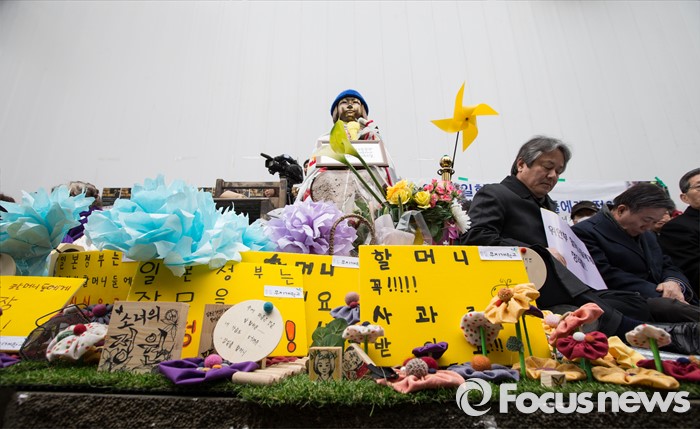 (서울=포커스뉴스) 2일 오후 서울 종로구 옛 주한일본대사관 앞에서 한국정신대문제대책협의회, 학생들을 비롯한 참석자들이 '제1220차 일본군 위안부 문제해결을 위한 정기 수요시위'를 하고 있다.