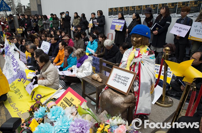 (서울=포커스뉴스) 2일 오후 서울 종로구 옛 주한일본대사관 앞에서 한국정신대문제대책협의회, 학생들을 비롯한 참석자들이 '제1220차 일본군 위안부 문제해결을 위한 정기 수요시위'를 하고 있다.