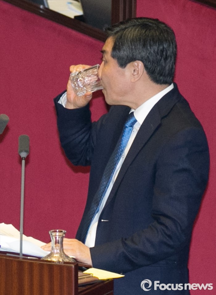 (서울=포커스뉴스) 테러방지법 직권상정에 반발해 야당이 세계 최장 기록의 필리버스터(무제한 토론)를 이어가고 있는 2일 오후 서울 여의도 국회 본회의장에서 토론에 참여한 이종걸 더불어민주당 원내대표가 이석현 국회 부의장의 발언동안 물을 마시고 있다. 야당은 이날 필리버스터를 중단하고 선거법 등을 처리할 예정이다.