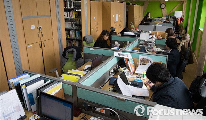(안산=포커스뉴스) 안산 단원고등학교 교육정상화를 위해 유가족, 재학생 학부모들 간의 교실 존치 논의가 계속되고 있는 2일 오후 경기도 안산시 단원고등학교 도서관에 마련된 교무실에서 교사들이 업무를 보고 있다.