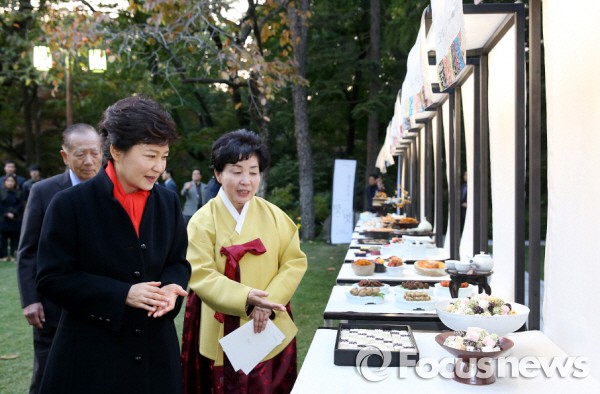 한복과 한식, 공예 등 250여 점의 한국 대표 문화콘텐츠를 한 자리에 모은 이번 전시회는 '메이드 인(人) 코리아-문화로 산업을 창조하다'라는 주제로 7일까지 서울 동대문디자인플라자에서 진행된 뒤 광주 아시아문화전당(3월 18~23일), 부산 벡스코(4월 1~6일)로 순회된다.박근혜 대통령은 2일 오후 서울 동대문디자인플라자에서 열린 한국문화 및 우수문화상품 전시회 개막식에 참석해 문화의 산업화를 강조했다. 사진은 2013년 10월 27일 청와대에서 한복려 궁중음식연구원장의 안내를 받으며 우리 전통음식에 대해 설명을 듣고 있는 박 대통령. 2013.10.27. <사진출처=청와대>
