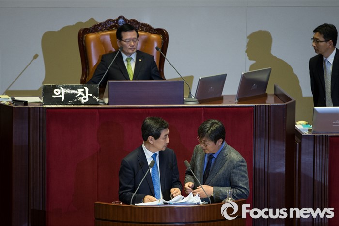 (서울=포커스뉴스) 더불어민주당 이종걸 원내대표가 12시간 31분만에 필리버스터(무제한 토론)을 끝마쳤다. 39번째 필리버스터 전사로 나섰던 이 원내대표를 끝으로 지난 9일간 필리버스터는 192시간만에 종료됐다. 2일 오후 서울 여의도 국회 본회의장에서 무제한 토론 중 이종걸 원내대표와 이춘석 원내수석부대표가 대화를 나누고 있다.
