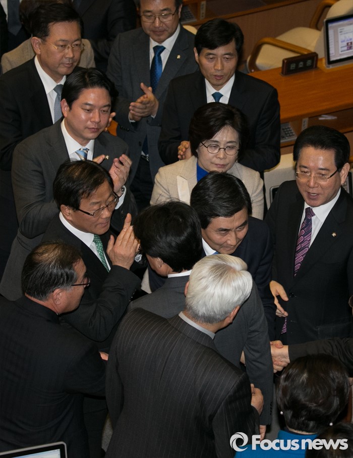 (서울=포커스뉴스) 테러방지법 직권상정에 반발해 야당이 세계 최장 기록의 필리버스터(무제한 토론)를 진행한 2일 오후 서울 여의도 국회 본회의장에서 마지막 주자인 이종걸 더불어민주당 원내대표가 토론을 마친 뒤 동료 의원들의 격려를 받으며 퇴장하고 있다. 마지막 주자로 나선 이 원내대표는 이날 정청래 의원의 기록인 11시간 40분을 경신한 12시간 31분을 기록하며 토론을 마쳤으며, 야당의 필리버스터는 약 193시간만에 종료됐다.