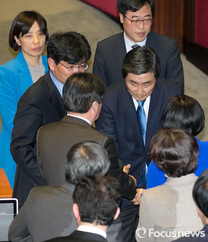 (서울=포커스뉴스) 테러방지법 직권상정에 반발해 야당이 세계 최장 기록의 필리버스터(무제한 토론)를 진행한 2일 오후 서울 여의도 국회 본회의장에서 마지막 주자인 이종걸 더불어민주당 원내대표가 토론을 마친 뒤 동료 의원들의 격려를 받으며 퇴장하고 있다. 마지막 주자로 나선 이 원내대표는 이날 정청래 의원의 기록인 11시간 40분을 경신한 12시간 31분을 기록하며 토론을 마쳤으며, 야당의 필리버스터는 약 193시간만에 종료됐다.