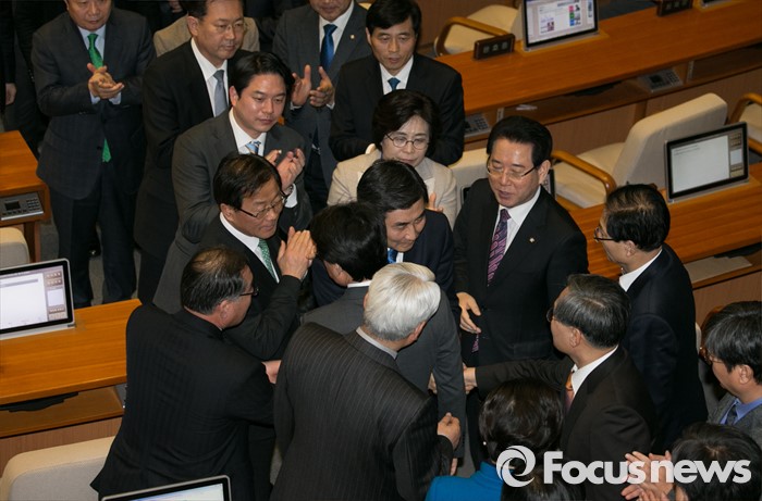 (서울=포커스뉴스) 테러방지법 직권상정에 반발해 야당이 세계 최장 기록의 필리버스터(무제한 토론)를 진행한 2일 오후 서울 여의도 국회 본회의장에서 마지막 주자인 이종걸 더불어민주당 원내대표가 토론을 마친 뒤 동료 의원들의 격려를 받으며 퇴장하고 있다. 마지막 주자로 나선 이 원내대표는 이날 정청래 의원의 기록인 11시간 40분을 경신한 12시간 31분을 기록하며 토론을 마쳤으며, 야당의 필리버스터는 약 193시간만에 종료됐다.