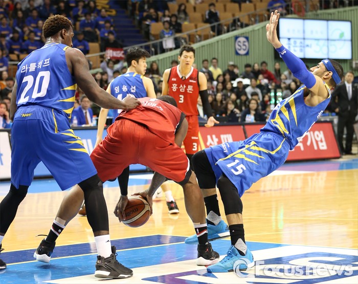 (서울=포커스뉴스) 2일 서울 잠실실내체육관에서 열린 2015-2016 프로농구 삼성-KGC 6강플레이오프 4차전에서 KGC 찰스 로드가 삼성 문태영의 수비를 뿌리치다 넘어뜨려 파울을 범하고 있다.