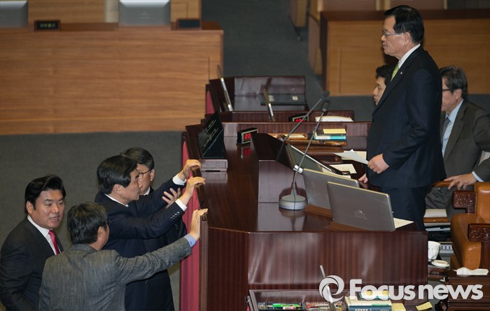 (서울=포커스뉴스) 2일 오후 서울 여의도 국회에서 열린 340회 국회(임시회) 7차 본회의에 참석한 이종걸 더불어민주당 원내대표, 이춘석 원내수석부대표가 정의화 국회의장의 모두발언에 항의하자 원유철 새누리당 원내대표, 조원진 원내수석부대표가 말리고 있다.