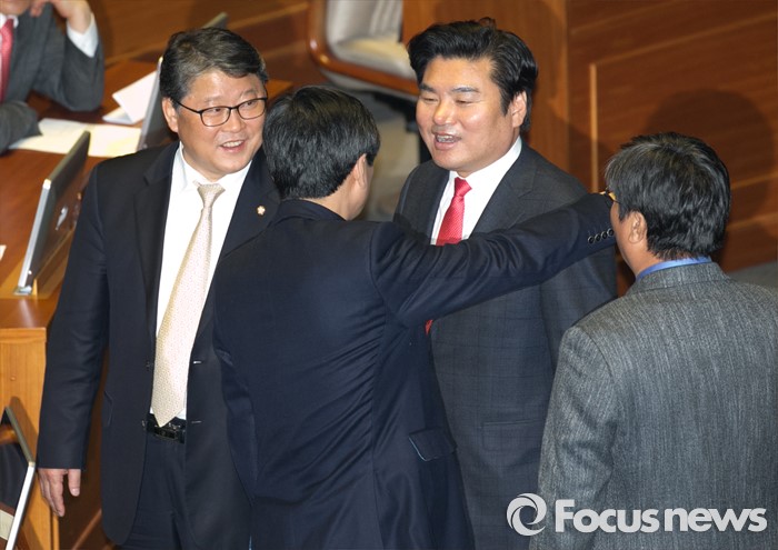 (서울=포커스뉴스) 2일 오후 서울 여의도 국회에서 열린 340회 국회(임시회) 7차 본회의에 참석한 이종걸(왼쪽 두번째) 더불어민주당 원내대표, 이춘석(오른쪽 첫번째) 원내수석부대표가 정의화 국회의장의 모두발언에 항의하자 원유철(오른쪽 두번째) 새누리당 원내대표, 조원진(왼쪽 첫번째) 원내수석부대표가 말리며 대화하고 있다.