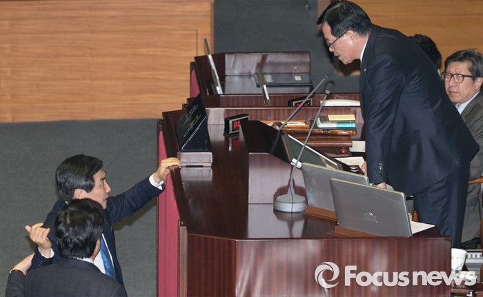 (서울=포커스뉴스) 2일 오후 서울 여의도 국회에서 열린 340회 국회(임시회) 7차 본회의에 참석한 이종걸 더불어민주당 원내대표가 정의화 국회의장의 모두발언에 항의하자 원유철 새누리당 원내대표가 말리고 있다.