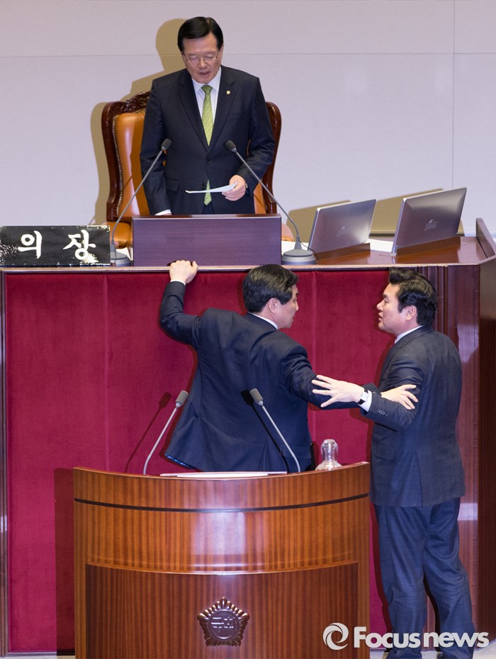 (서울=포커스뉴스) 2일 오후 서울 여의도 국회에서 열린 340회 국회(임시회) 7차 본회의에 참석한 이종걸 더불어민주당 원내대표, 이춘석 원내수석부대표가 정의화 국회의장의 모두발언에 항의하자 원유철 새누리당 원내대표가 말리고 있다.