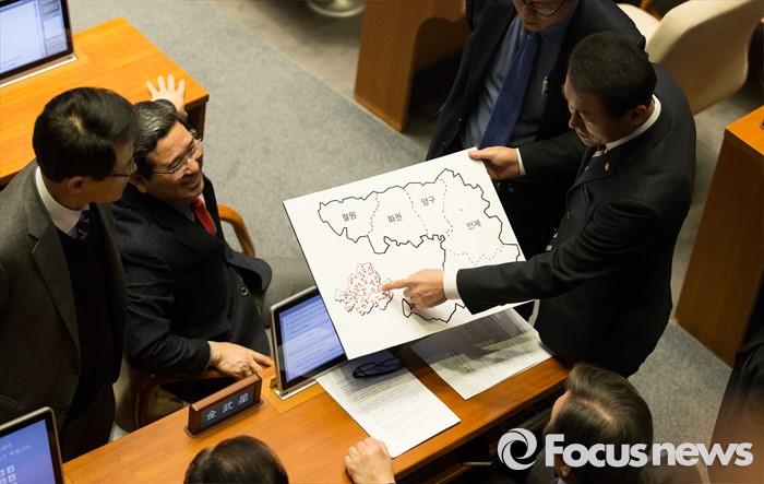 (서울=포커스뉴스) 2일 오후 서울 여의도 국회에서 열린 340회 국회(임시회) 7차 본회의에서 황영철 새누리당 의원이 김무성 새누리당 대표를 비롯한 의원들에게 강원도 지역 선거구에 대해 이야기하고 있다.