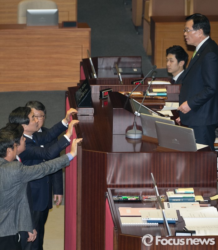 (서울=포커스뉴스) 2일 오후 서울 여의도 국회에서 열린 340회 국회(임시회) 7차 본회의에 참석한 이종걸 더불어민주당 원내대표, 이춘석 원내수석부대표가 정의화 국회의장의 모두발언에 항의하자 원유철 새누리당 원내대표, 조원진 원내수석부대표가 말리고 있다.
