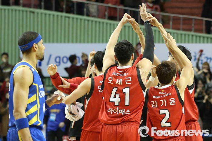 (서울=포커스뉴스) 2일 서울 잠실실내체육관에서 열린 2015-2016 프로농구 삼성-KGC 6강플레이오프 4차전에서 삼성을 물리치고 4강플레이오프에 진출한 KGC 선수들이 하이파이브를 하며 기뻐하고 있다.