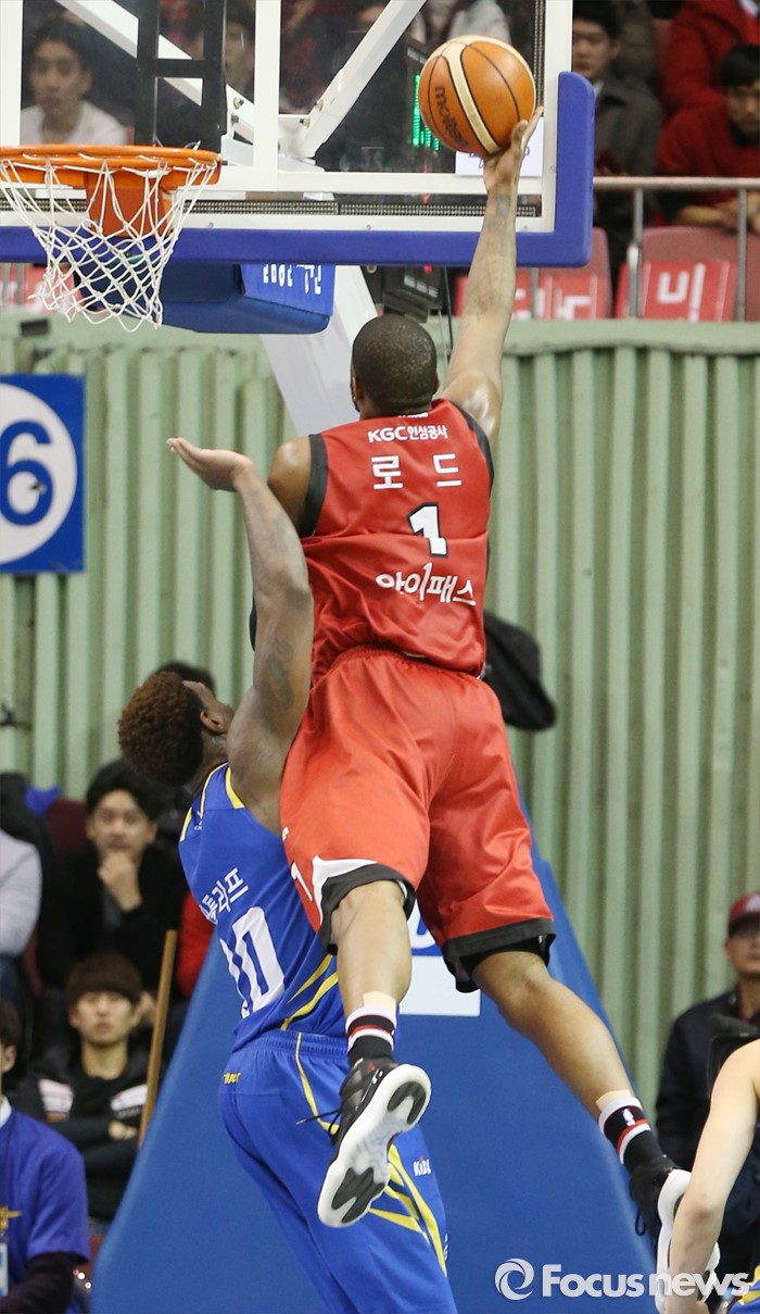 (서울=포커스뉴스) 2일 서울 잠실실내체육관에서 열린 2015-2016 프로농구 삼성-KGC 6강플레이오프 4차전에서 KGC 찰스 로드가 삼성 라틀리프의 마크 위로 레이업슛을 시도하고 있다.