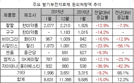 종근당 ‘센돔’은 출시 두달만에 월처방액 10억원을 돌파하며, 한미약품 구구정과 치열한 경쟁을 펼쳤지만 올해 1월에는 6억원대로 감소했다.