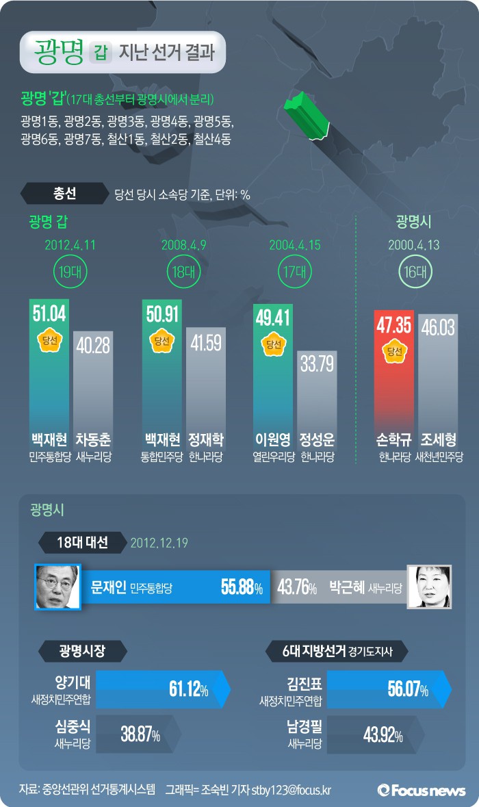 (서울=포커스뉴스) 야권 지지성향이 월등히 높은 광명시는 ‘야당의 텃밭’이라는 불리는 선거구답게 지난 18대 대선과 6회 전국동시지방선거에서 야당이 우세했다.