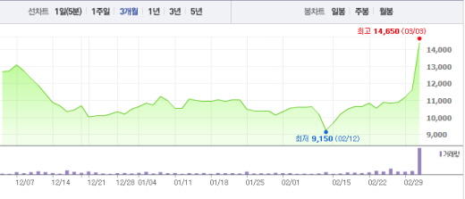3일 오전 10시37분 현재 NEW는 전날보다 2900원(24.89%) 오른 1만4550원에 거래중이다.