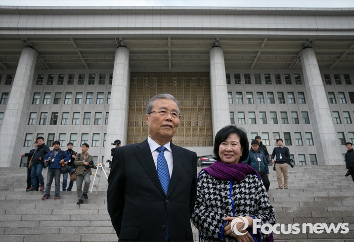 (서울=포커스뉴스) 김종인(왼쪽) 더불어민주당 비대위 대표와 손혜원 홍보위원장이 3일 오전 서울 여의도 국회 앞에서 열린 달리는 정책의자 발대식에 참석해 대화하고 있다.