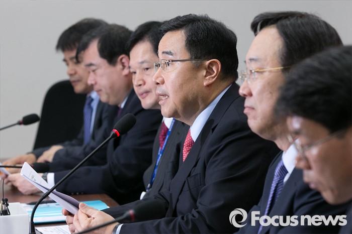 (서울=포커스뉴스) 김정훈(오른쪽 세번째) 새누리당 정책위의장이 3일 오전 서울 여의도 국회에서 총선공약 배려나누기 기자간담회에 참석해 인사말을 하고 있다.