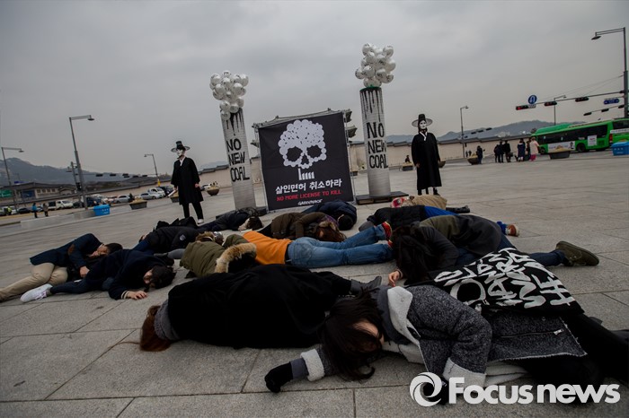(서울=포커스뉴스) 3일 오전 서울 종로구 광화문 광장에서 그린피스 회원들이 충남지역 신규 석탄화력발전소 허가 취소를 촉구하는 퍼포먼스를 펼치고 있다.