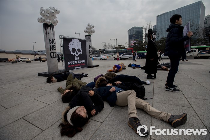 (서울=포커스뉴스) 3일 오전 서울 종로구 광화문 광장에서 그린피스 회원들이 충남지역 신규 석탄화력발전소 허가 취소를 촉구하는 퍼포먼스를 펼치고 있다.