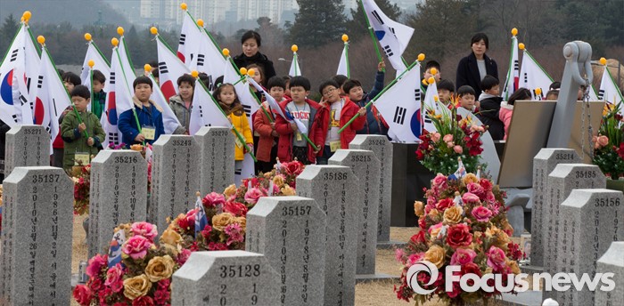 (대전=포커스뉴스) 3일 오전 입학 후 첫 수업에 들어간 대전 화정초등학교 1학년 신입생들이 대전 유성구 국립대전현충원 천안함 46용사 묘역을 찾아 참배하고 있다.