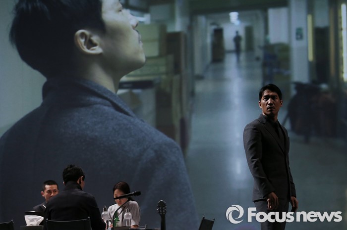 (서울=포커스뉴스) 3일 오후 서울 중구 명동예술극장에서 열린 연극 '빛의 제국' 프레스콜 행사에 참석한 배우 지현준이 주요장면을 시연하고 있다.