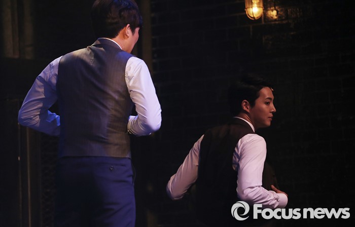 (서울=포커스뉴스) 3일 오후 서울 종로구 대명문화공장에서 열린 뮤지컬 '쓰릴 미' 프레스콜 행사에 참석한 배우 강동호(오른쪽)가 주요장면을 시연하고 있다.