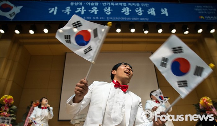 (서울=포커스뉴스) 3일 오후 서울 종로 한국기독교100주년 기념관에서 열린 기독자유당 창당대회에서 참가자들이 축하 공연을 하고 있다.