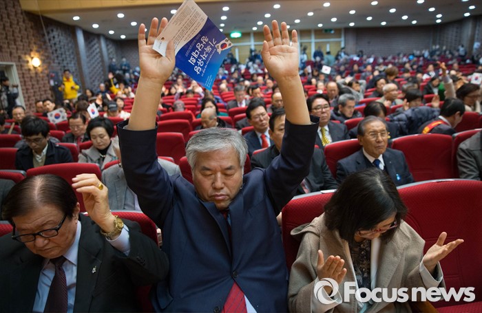 (서울=포커스뉴스) 3일 오후 서울 종로 한국기독교100주년 기념관에서 열린 기독자유당 창당대회에서 참가자들이 기도를 하고 있다.