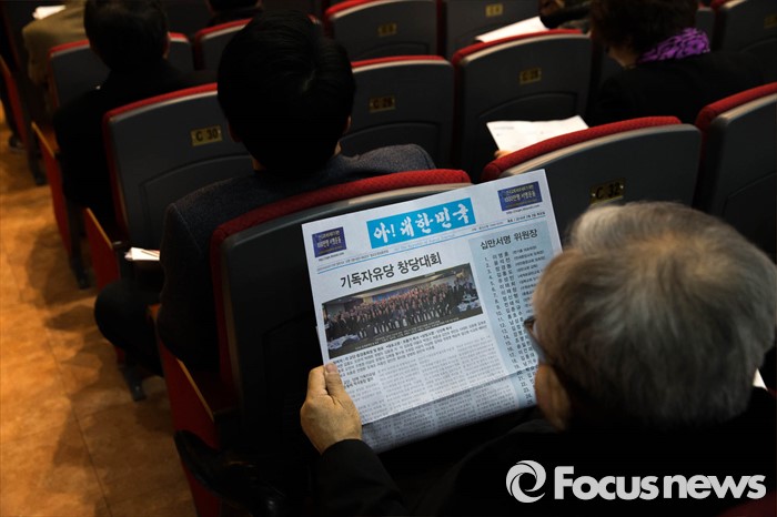 (서울=포커스뉴스) 3일 오후 서울 종로 한국기독교100주년 기념관에서 열린 기독자유당 창당대회에서 한 참가자가 창당 관련 정보가 담긴 신문을 읽고 있다.