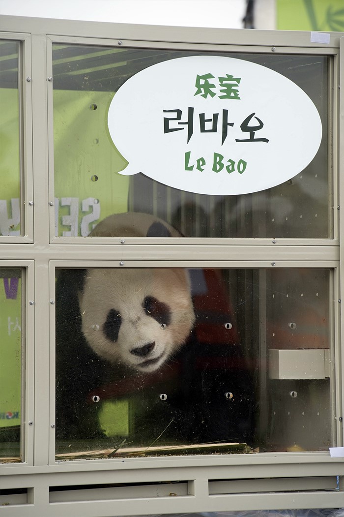 (서울=포커스뉴스) 중국 청두 공항을 출발해 3일 오후 인천공항으로 입국한 판다 러바오(수컷)가 공개되고 있다. <사진제공=삼성물산>
