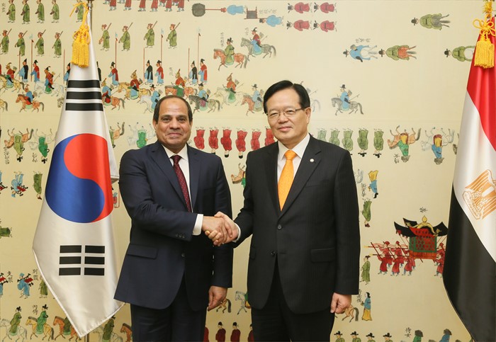 (서울=포커스뉴스) 정의화(오른쪽) 국회의장이 3일 오후 서울 여의도 국회 접견실에서 압델 파타 알시시(Abdel Fattah Al-Sisi) 이집트 대통령을 접견, 악수를 하고 있다. 이날 양국은 우호 협력관계 증진 방안에 대해 논의했다. <사진제공=국회>