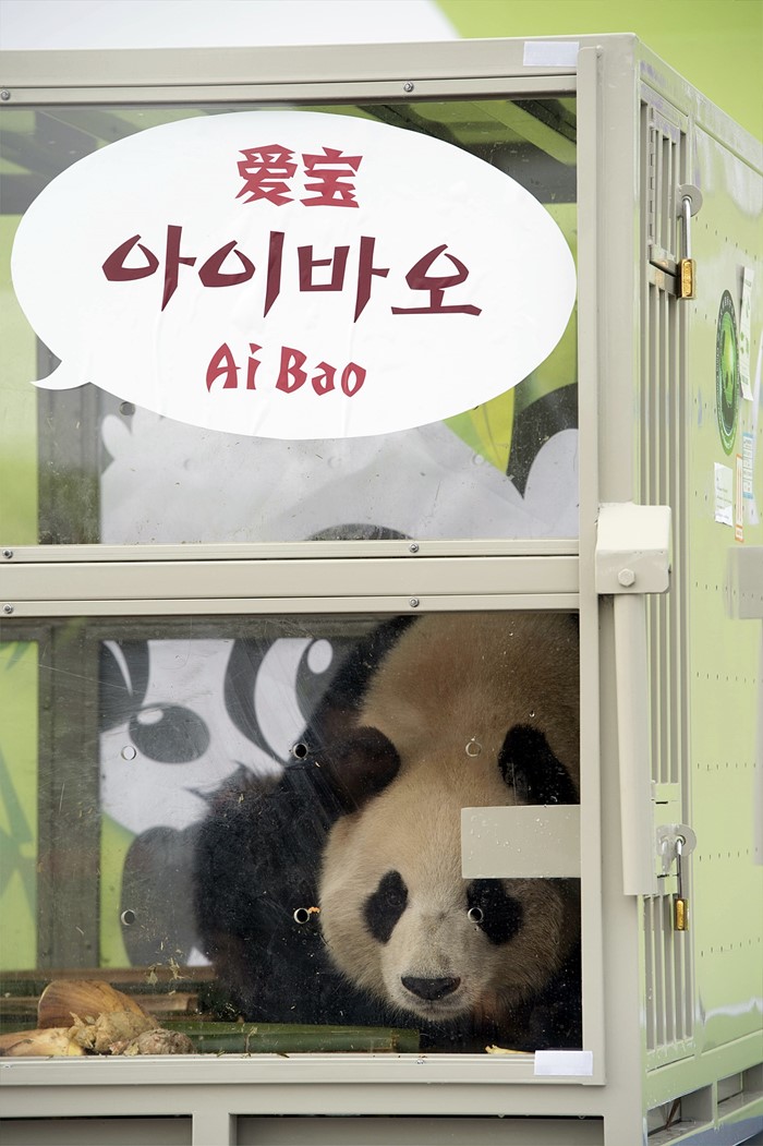 (서울=포커스뉴스) 중국 청두 공항을 출발해 3일 오후 인천공항으로 입국한 판다 아이바오(암컷)가 공개되고 있다. <사진제공=삼성물산>