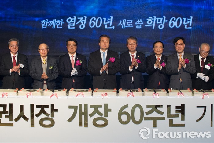 (서울=포커스뉴스) 3일 오후 서울 영등포구 63빌딩에서 증권시장 개장 60주년 기념식에 참석한 내빈들이 떡케익 커팅식 후 박수를 치고 있다.왼쪽 세번째부터 진웅섭 금융감독원 원장, 김무성 새누리당 대표, 임종룡 금융위원장, 최경수 한국거래소 이사장.