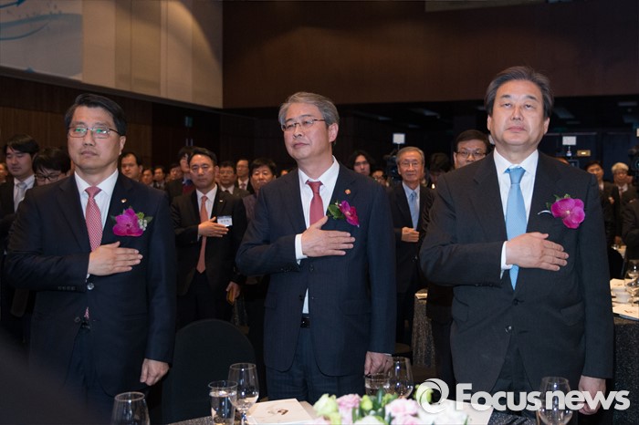(서울=포커스뉴스) 3일 오후 서울 영등포구 63빌딩에서 증권시장 개장 60주년 기념식에 참석한 주요 인사들이 국민의례를 하고 있다. 왼쪽부터 진웅섭 금융감독원 원장, 임종룡 금융위원장, 김무성 새누리당 대표. 이번 행사는 지난 1956년 3월 3일 대한증권거래소의 출범과 함께 문을 연 한국 증시의 60년 발자취를 기념하기 위해 마련됐다.