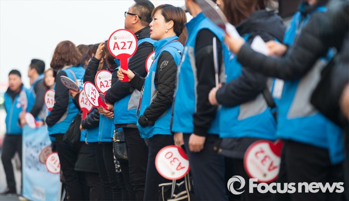 (인천=포커스뉴스) 4일 오전 인천 연수구 송도신항에 정박해 있는 아시아 최대 크루즈인 '퀀텀 오브 더 시즈'호 앞에서 가이드들이 관광객을 기다리고 있다.
