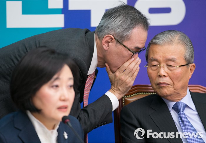 (서울=포커스뉴스) 김종인(오른쪽) 더불어민주당 비대위 대표가 4일 오전 서울 여의도 국회에서 열린 비대위-선대위 연석회의에 참석해 주진형(가운데) 총선정책공약단 부단장으로부터 보고를 받고 있다. 왼쪽은 박영선 비대위원.