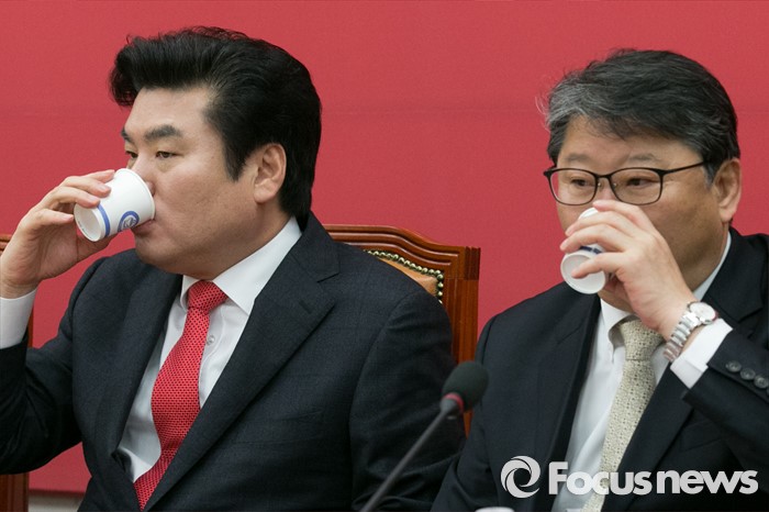 (서울=포커스뉴스) 원유철(왼쪽) 새누리당 원내대표와 조원진 원대수석부대표가 4일 오전 서울 여의도 국회에서 열린 원내대책회의에 참석해 물을 마시고 있다.