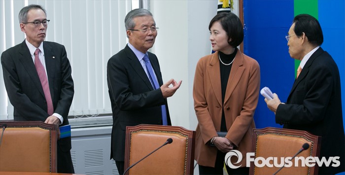 (서울=포커스뉴스) 김종인 더불어민주당 비대위 대표가 4일 오전 서울 여의도 국회에서 비대위-선대위 연석회의를 마친 뒤 참석자들과 대화하고 있다. 왼쪽부터 주진형 총선공약단 부단장, 김 대표, 유은혜 선대위원, 송현섭 전국노인위원장.
